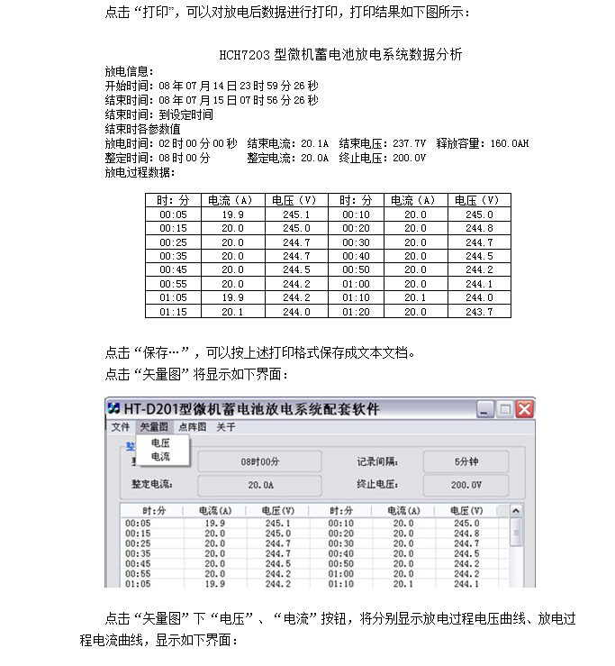 5.5 記錄放電過程的電流電壓值(每5分鐘一筆),供事后分析查閱。放電數(shù)據(jù)可通過U盤上傳至電腦,使用配套軟件對其進(jìn)行全面分析,數(shù)據(jù)可以以報(bào)表、圖形等形式顯示,并可通過打印機(jī)打印數(shù)據(jù)及圖形,方便用戶查閱和整理。