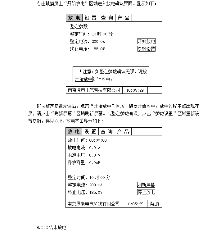 菜單區(qū):放電—放電界面,在參數(shù)設(shè)定完畢后,點(diǎn)擊“開始放電”進(jìn)入放電狀態(tài);